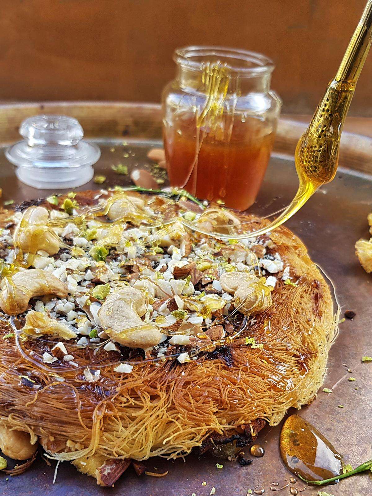 להניח ולסדר את שערות הקדאיף במחבת (שכבה עדינה אחת). על השערות יש לפרוס את האננס המסוכר, מעליו האננס החמצמץ, הקשיו הקלוי ואז השקדים (לשמור קצת מכמות השקדים והקשיו לקישוט). מעל הכל לפזר כך דבש גדולה בשביל לאחד הכל.