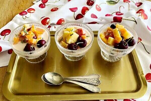 מצננים את קוקטייל הפירות, את הפירות הטריים ואת קרם הקוקוס.