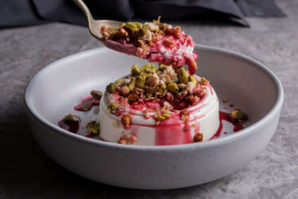 מסעדת TYO מציעה מלבי אקספרס - קולי פטל, קרם מלבי שערות קדאיף ואגוזים מסוכרים. המנה מוצעת במשלוח בלבד.