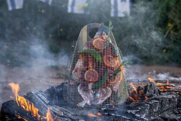 - מניחים על הדג את הלימון הפרוס והפלפל החריף וסוגרים הכל ברשת ברזל (ראו תמונה, ניתן למצוא בחנויות בניין).