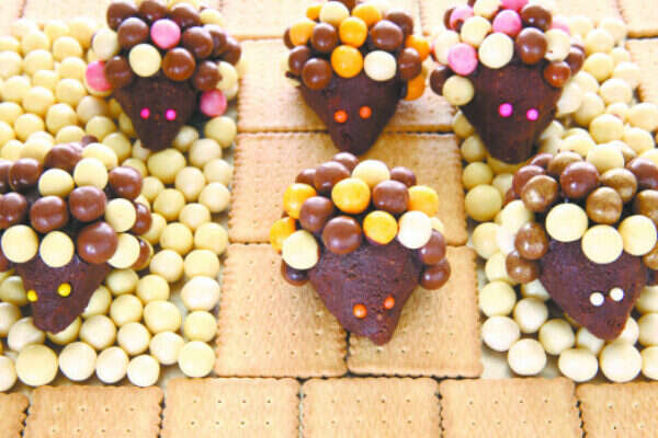 6. לצד המחודד מדביקים שתי סוכריות צבעוניות קטנות, כך שייראו כמו עיניים, ונועצים מקל שוקולד מריר חתוך כך שייראה כמו זנב. שומרים במקרר עד להגשה.