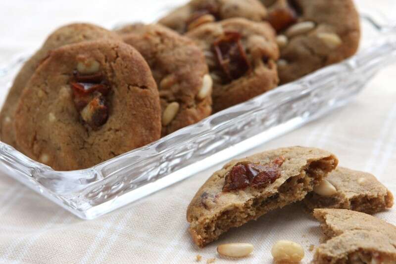 עוגיות מוקה, שוקולד לבן, תמרים וצנוברים