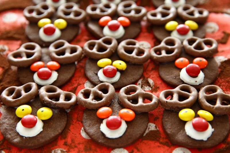 7. בעזרת השוקולד המומס מדביקים בייגלה כאוזניים ובעזרת בצק סוכר וסוכריות צבעוניות יוצרים פנים של דובי.