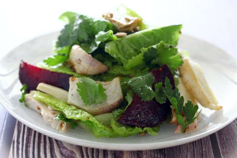 6. מערבבים בעדינות את הירקות הצלויים עם עליי החסה והתבלין, מתבלים ברוטב ומגישים מיד.