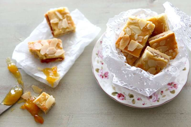 4. יוצקים את הבלילה על תבנית אפיה מרופדת נייר אפייה ומשטחים לשכבה דקה, מפזרים שבבי שקדים ואופים בתנור בחום בינוני נמוך (170 מעלות) כ-12 דקות עד שמזהיב קלות.
