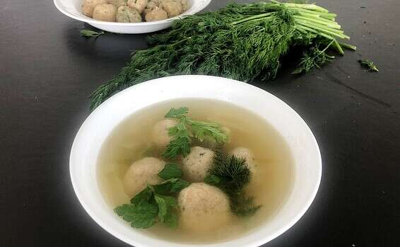 מרק עוף עם קניידלך שקדים ועשבי תיבול
