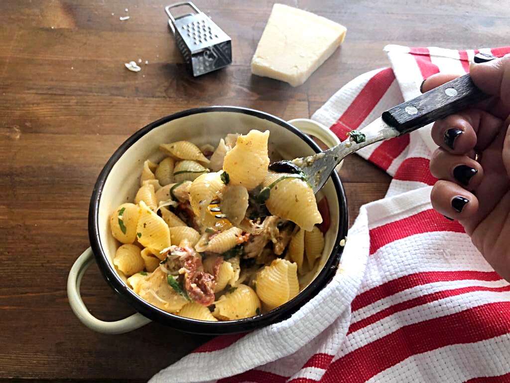 יחד עם זאת, מצאתי שאם אני מסננת את תכולת האנטיפסטי מן השמן המיותר ומשתמשת בכמות מדודה של פסטו ארטישוק אני יכולה לשדרג את מנת הפסטה היומית ואף להפוך אותה לחגיגית יותר, וכך עשיתי.