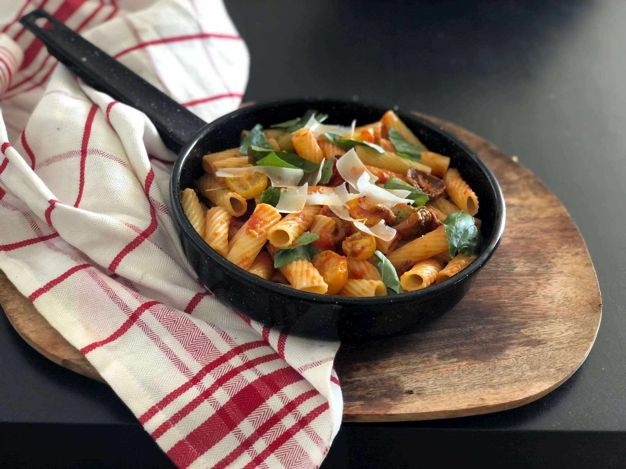 3. מחממים את הרוטב במחבת רחבה, מוסיפים את הפסטה המבושלת ואת העגבניות הצלויות.
