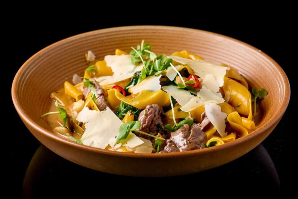 פפרדלה ראגו טלה - תבשיל ראגו טלה, ירקות שורש, זיתים שחורים ועשבים ארומטיים.
