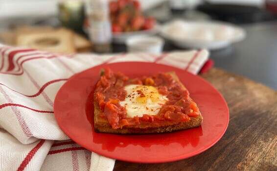 5. מכסים את הלחם בשקשוקה, מתבלים את הביצה, מכסים במכסה ומבשלים עד שהביצה נקרשת כמו שאוהבים.