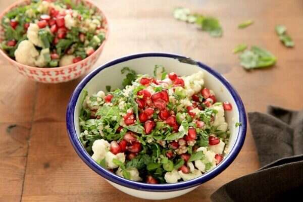 מתכון פשוט לסלט מרענן וקליל המשלב כרובית טרייה, קייל, פטרוזיליה, נענע, קינואה וגרעיני רימון