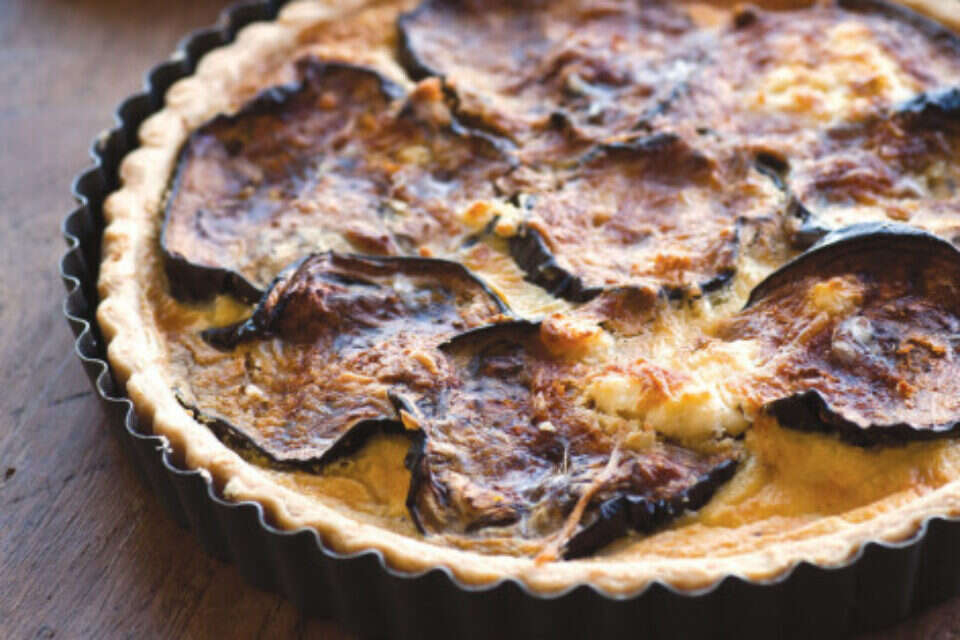 קיש צבעוני במילוי חצילים, צימוקי עגבניות מיובשות וגבינת קשקבל. בבצק יש גם חמאה, שמעניקה לו טעם ופריכות, וגם שמן זית, שמעשיר את הבצק. החומץ בקלתית מונע מהבצק להשחיר בזמן המנוחה במקרר