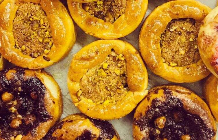- מאפי שמרים עם קרם וניל ותפוחים/קרם שקדים ואגסים/שוקולד ואגוזים/חלבה פיסטוק.