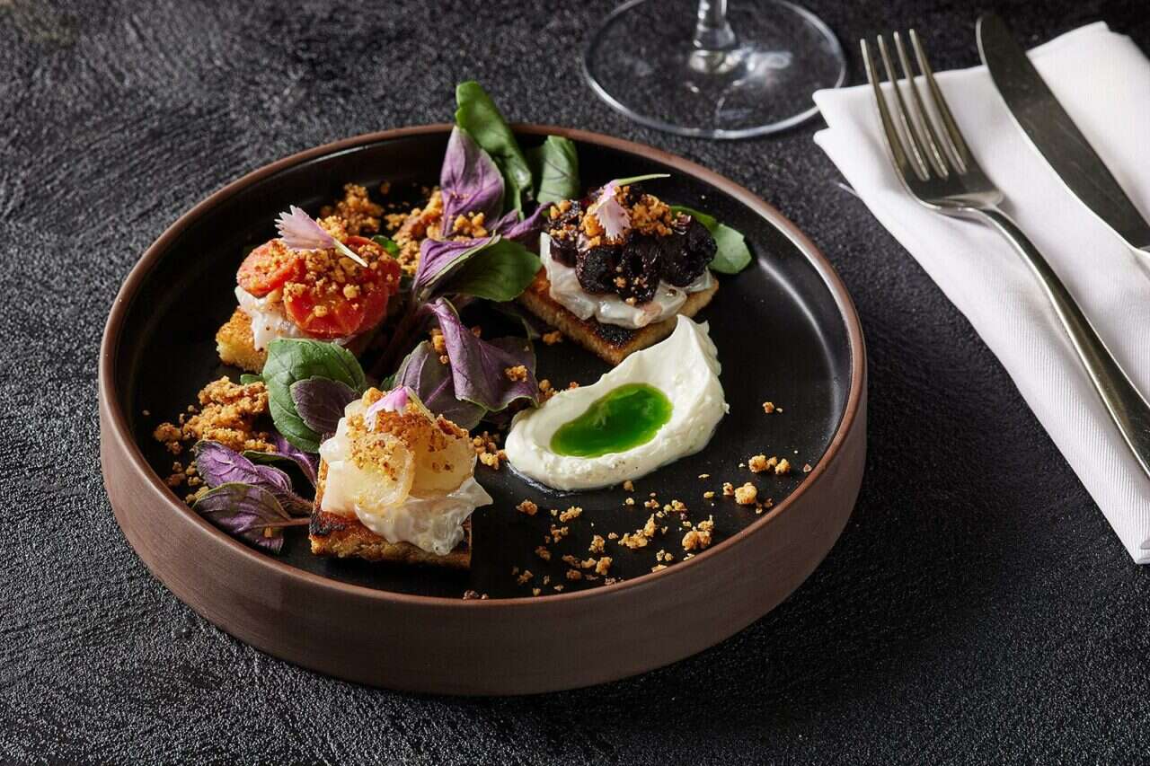 ברוסקטת טרטר ים עם גזר צלוי , איולי יוזו , צ'ילי, קרמבל שקדים וקרם פרש הדרים 38 שקלים