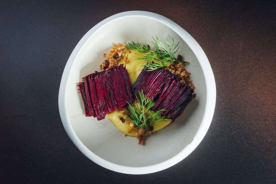 מופתעים מהמרקמים והטעמים שפתחו את הארוחה, אנחנו מקבלים את המנה הבאה, ״גראטן״ סלק מבושל (ואז אפוי) בציר היביסקוס על פירה ראטה ותפוזים. כיף להרגיש גל מרענן כ"כ של תעוזה ויצירתיות שאמזלג מבטא בעיקר בשילובים יוצאי דופן של חומרי גלם.