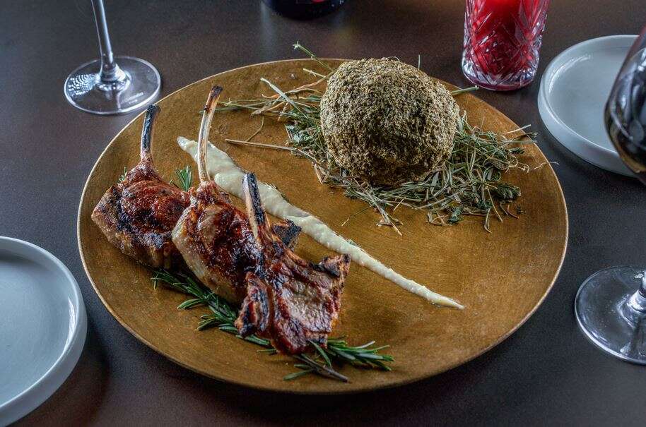אנחנו ממשיכים -צלעות טלה בגריל, קרם שום, עלי חמציץ ותפוח אדמה עטוף ואפוי בעשבים יבשים.