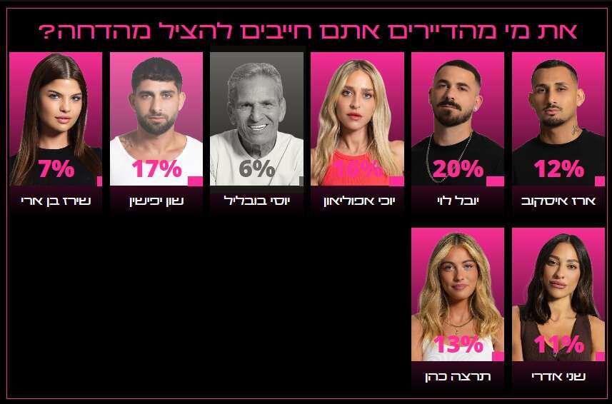 תוצאות סקר האח הגדול, 30 באוגוסט 2025: יוסי בובליל הודח, את טבלת ההצבעות מוביל יובל לוי, עם 20% מהקולות, ואחריו שון יפישין, עם 17%. מבט בוחן בתוצאות הסקר מגלה גם ששירז בן ארי היתה קרובה מאוד להדחה השבוע.