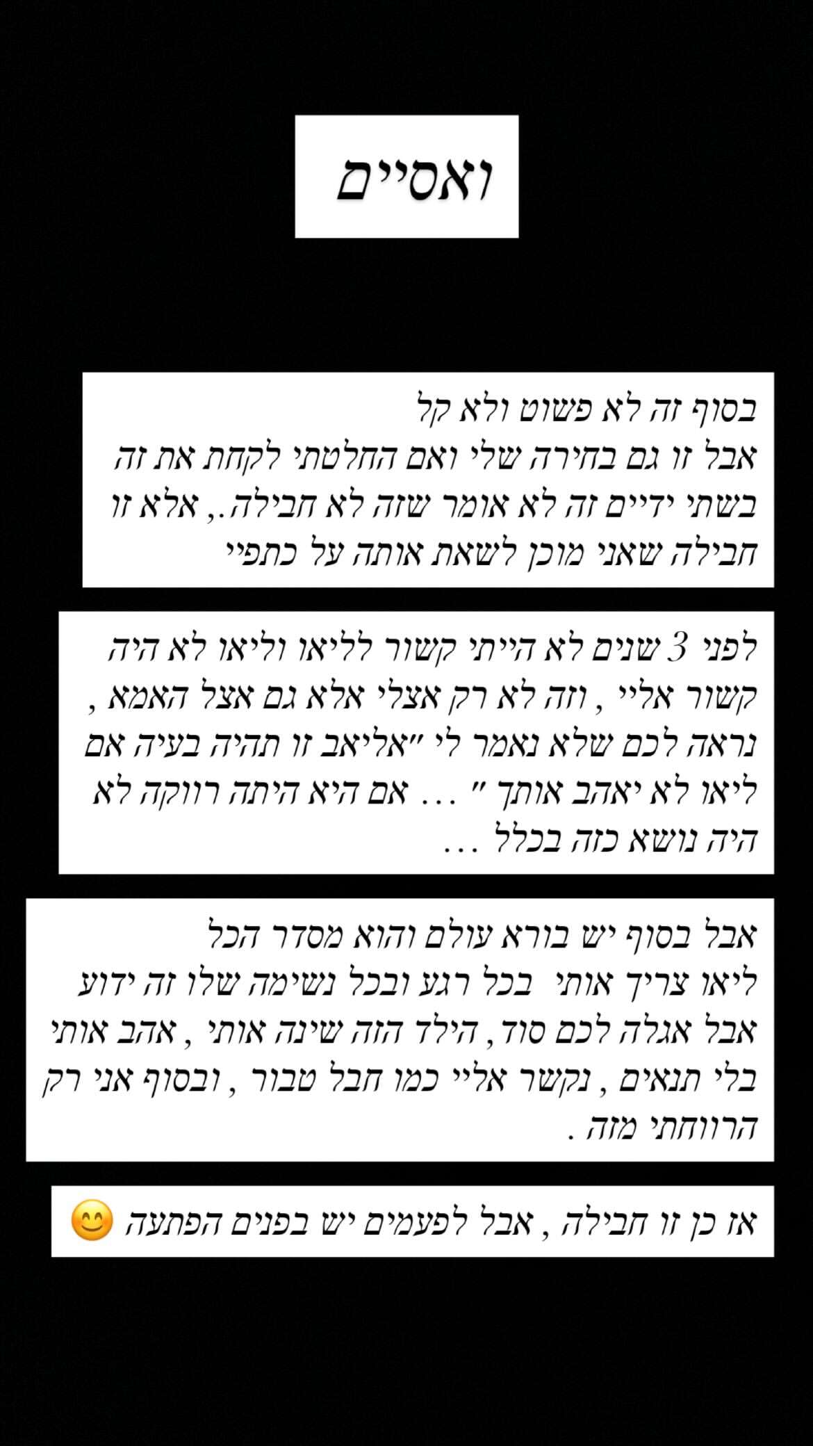 "בחייאת ראבקום מה הקשר לסכסוך", שיתף אליאב את העוקבים שלו בסערת הרגשות שחש בהמשך לתגובה של אותה הגולשת. "בגלל שאני עם מישהי עם ילד אני אומר שהוא צודק", הדגיש. "כמות המחשבות, הדיבורים, השיחות שהיו לנו בגלל הילד לא פסקו. מה נראה לכם? שזו לא חבילה? זו אכבר חבילה".