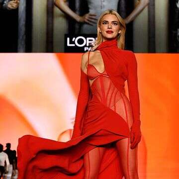 היא הציגה השבוע לראשונה את הלוק החדש שלה: בלונד פלטינה קטלני. על המסלול היא לובשת שמלה אדומה ושקופה למחצה - עיצוב של בית האופנה מוגלר.