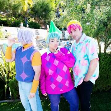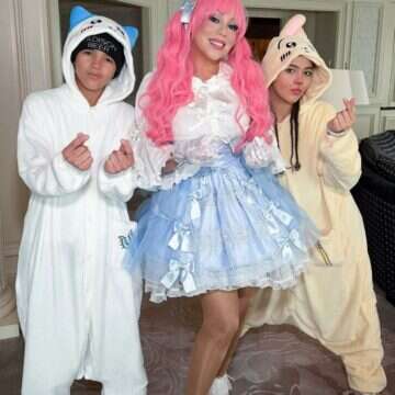 בהשראה יפנית. מריה קארי הצטלמה עם ילדיה כשהיא בשיער ורוד, שמלה כחולה מתפנפנת ונעלי פלטפורמה נוצצות, בזמן שהשניים לבשו פיג'מות דמויות חיות.