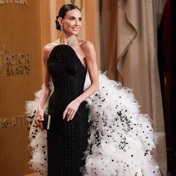 דמי מור עשתה זה כמו שרק היא יודעת והגיעה לטקס בשמלת סטרפלס שחרה עם אלמנט טול מנוקד מהפנטת של סקיפארלי