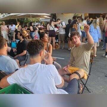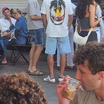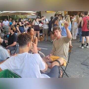 צהריים שטופי שמש בתל אביב. מצד אחד, טל מורד בשדרה עם חברים נהנה מתה קר
