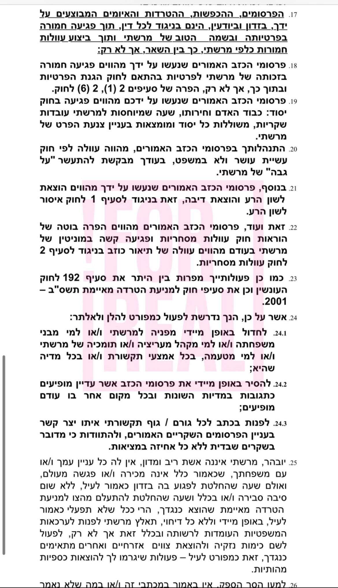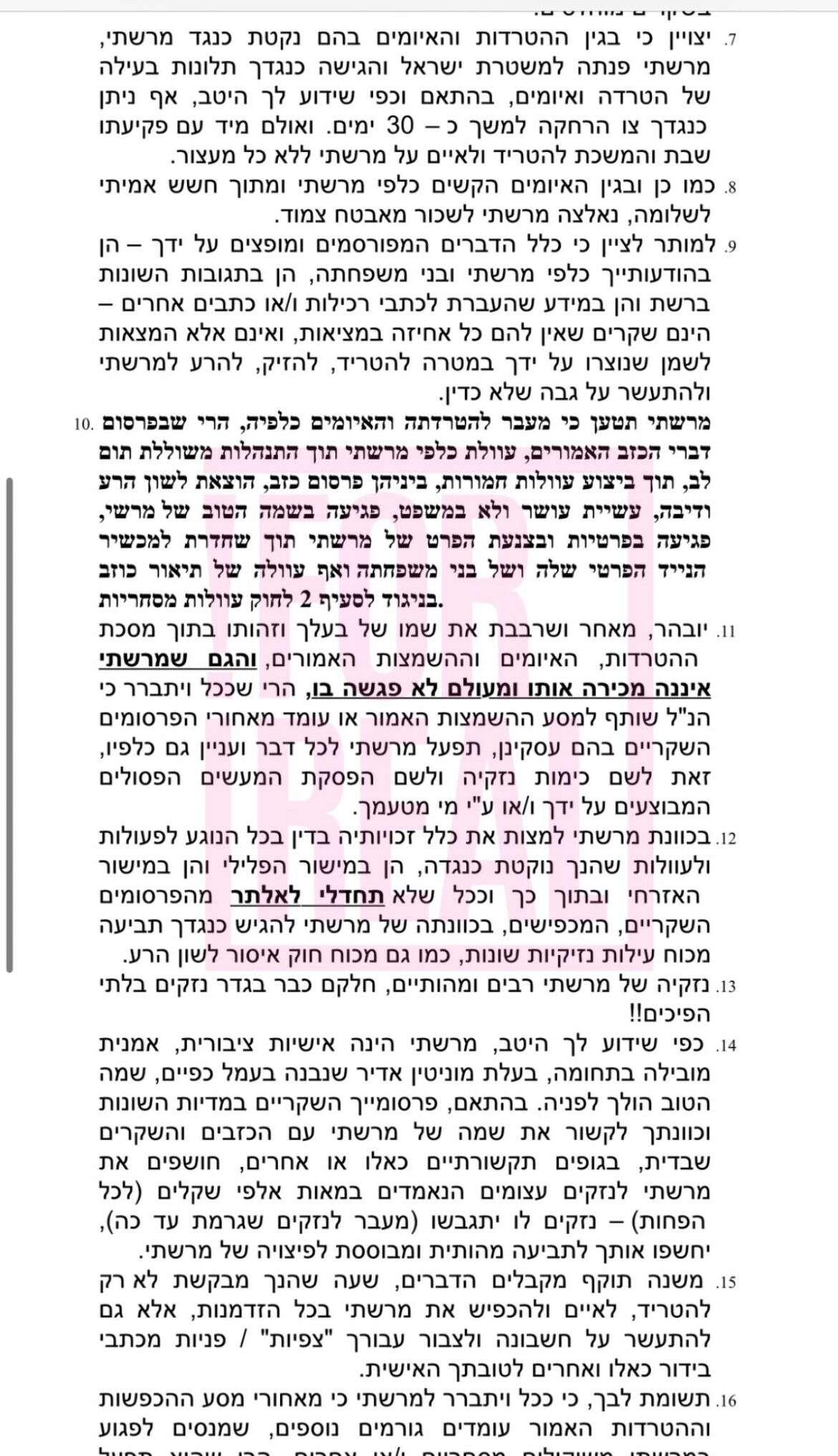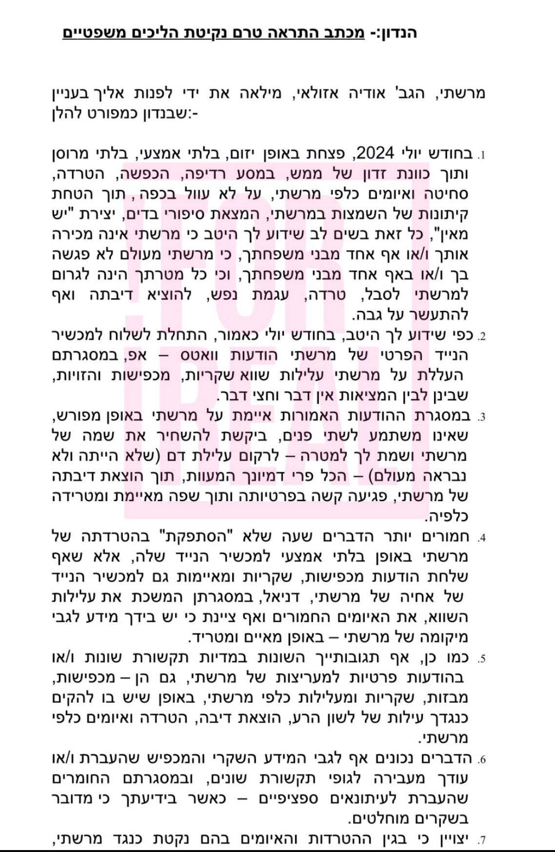 מסמך נוסף שהגיע לידי "For Real" הוא מכתב לפני תביעה ששלח עורך דינה של אודיה לאותה האישה: "פצחת באופן יזום, בלתי אמצעי, בלתי מרוסן ותוך כוונת זדון של ממש, במסע רדיפה, הכפשה, הטרדה, סחיטה ואיומים כלפי מרשתי, על לא עוול בכפה, תוך הטחת קיתונות של השמצות במרשתי, המצאת סיפורי בדים, יצירת "יש מאין", כל זאת בשים לב שידוע לך היטב כי מרשתי אינה מכירה אותך ו/או אף אחד מבני משפחתך, כי מרשתי מעולם לא פגשה בך ו/או באף אחד מבני משפחתך, וכי כל מטרתך הינה לגרום למרשתי לסבל, טרדה, עגמת נפש, להוציא דיבתה ואף להתעשר על גבה".