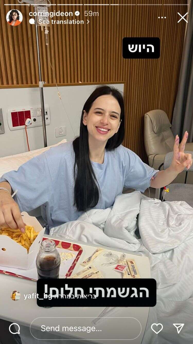 דקות לאחר מכן שיתפה עוד, כשהיא כבר בביתה. "הכל בסדר, אני בבית", הרגיעה ופירטה: "עשיתי הרמת חזה, שזה משהו שחלמתי עליו מלא זמן, סוף סוף זה הגיע, ואני בטוב, אני מתאוששת". גדעון הפנתה את המצלמה לכיוון אימה ורדה והוסיפה: "והחיים הזאת שלי, שהייתה אמורה לחזור מחו"ל היום בלילה, עשתה לי הפתעה ופגשה אותי אתמול בצהריים בכניסה לבית החולים. לא הייתי עוברת את זה בלעדייך". ורדה העירה: "גם אני לא נותנת לך לעבור את זה בלעדיי". לבסוף סיכמה קורין: "וזהו, והכל טוב. אני שמחה, ואני אתאושש ונדבר".