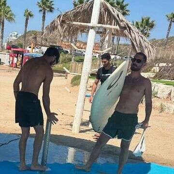 ביום השביתה הארצי, אודי נאור ומתן עובד, כוכבי "המירוץ למיליון", תועדו מתכוננים לגלישה בחוף הים וגורמים לתשומת לב – בלי חולצה.