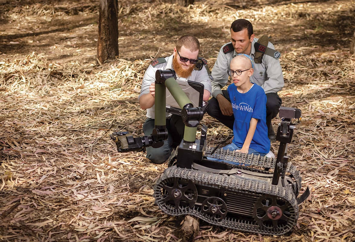 מובן שהוא לא מוותר על ההתנסות, אז אנחנו יוצאים לשטח והוא משחק עם הרובוטים על מכשול, שואל, בודק ומאתגר את הקצינים גבוהי האיי.קיו כמותו, וכולם מוצאים שפה משותפת.