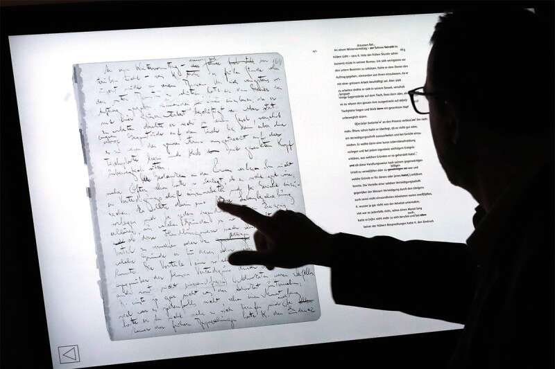 קפקא לא זכה לעלות ארצה, כתביו דווקא כן. אדם בוחן את כתב היד של "המשפט" בתערוכה המוקדשת לסופר// צילום: אי.פי.אי