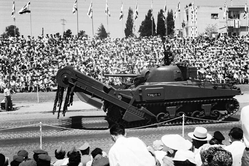 בתמונה: טנק מצויד במערכות לפיצוץ מוקשים של חיל ההנדסה, במהלך המצעד ברחובות תל אביב, ביום העצמאות ה־11 של מדינת ישראל // צילום: משה פרידן/לע"מ