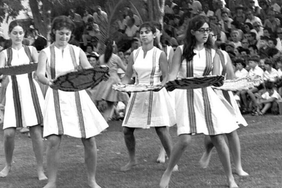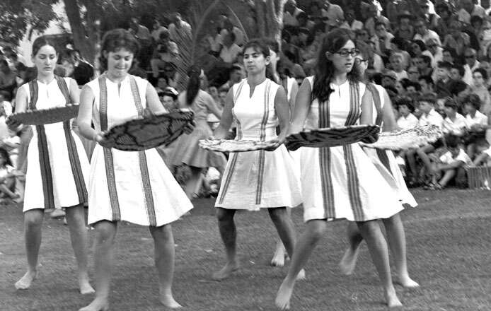 טעינו? נתקן! אם מצאתם טעות בכתבה, נשמח שתשתפו אותנוביום ראשון הקרוב, חג השבועות, ייערכו במושבים רבים ובקיבוצים ברחבי ישראל מצעדי הביכורים המסורתיים. בתמונה: בנות קיבוץ בגן שמואל בחגיגת השבועות, מאי 1975