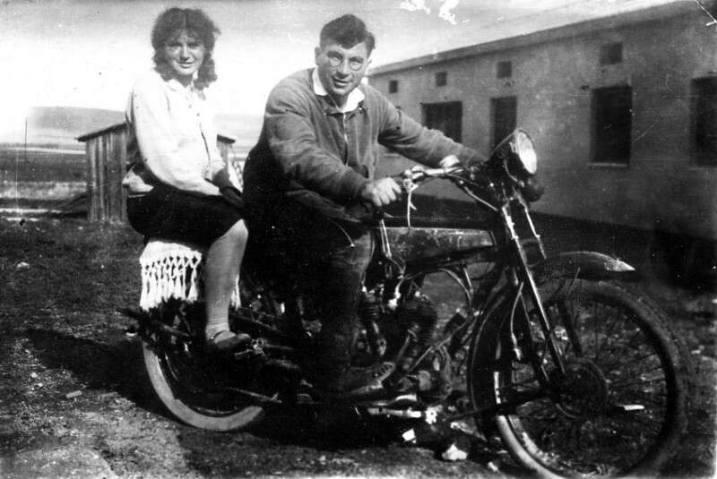 אליעזר עם אשתו שולמית על המוטורסייקל ששלחו הוריו מגרמניה, 1931. "זרע ראשון לפריצת העקרונות".