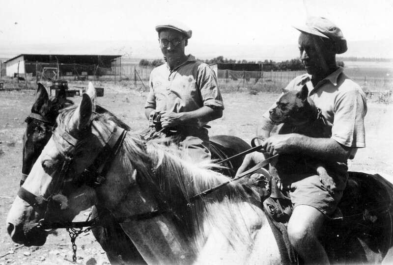 אליעזר (משמאל) עם קובה לנס וכלב יוצאים לשמירת שדות, 1935.