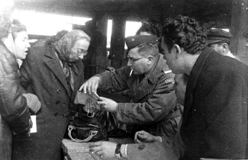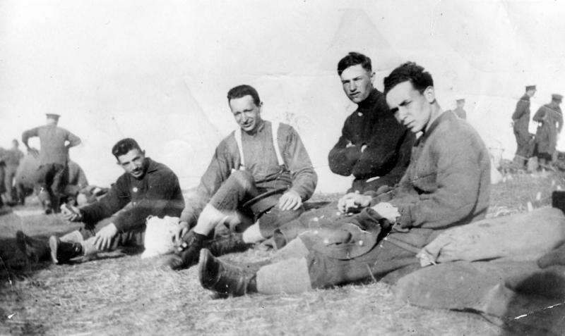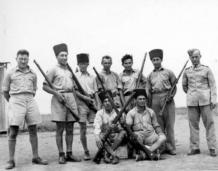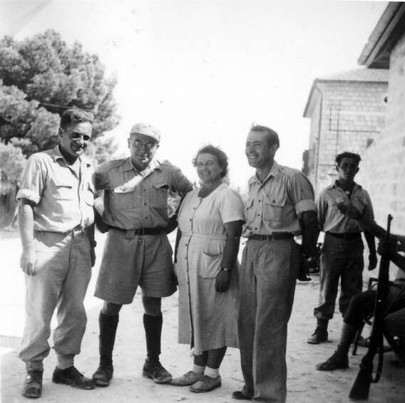 אליעזר (במרכז) עם חיילי גדוד 13 לאחר כיבוש נצרת. לידו החברה גוסטה מבית אלפא. גויסה ע"י אברהם יפה מג"ד 13 גולני לעזור בהכנת אוכל לחיילים.