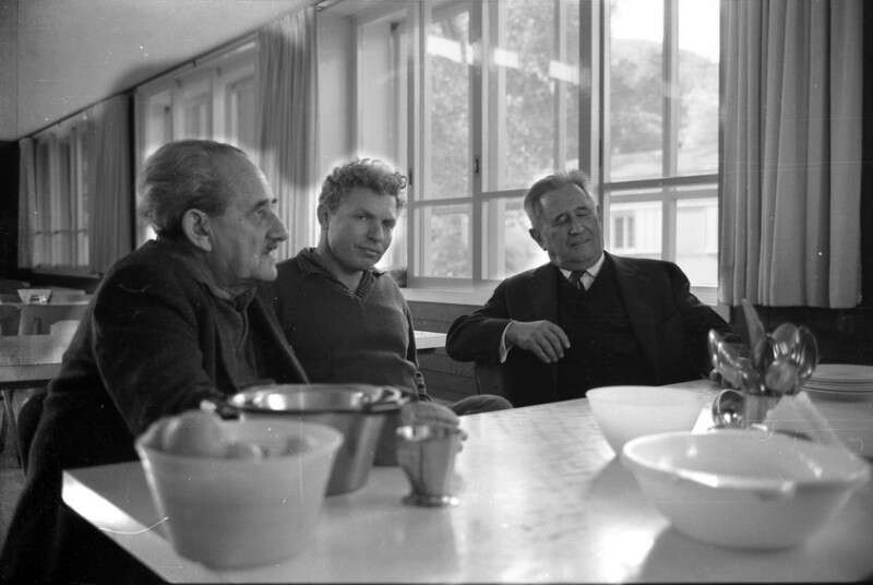 ד"ר נחום גולדמן נשיא ההסתדרות הציונית, מבקר בבית אלפא. משמאלו ישראל זמיר ואליעזר הכהן חברי בית אלפא.