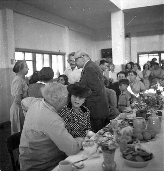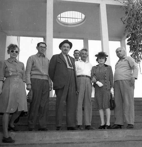 ביקור בבית שטורמן, מימין: אהרון ציזלינג, ורה ויצמן, שלמה לביא, חיים ויצמן, שמואל סבוראי ויהודית זידמן מזכירת המועצה גלבוע: