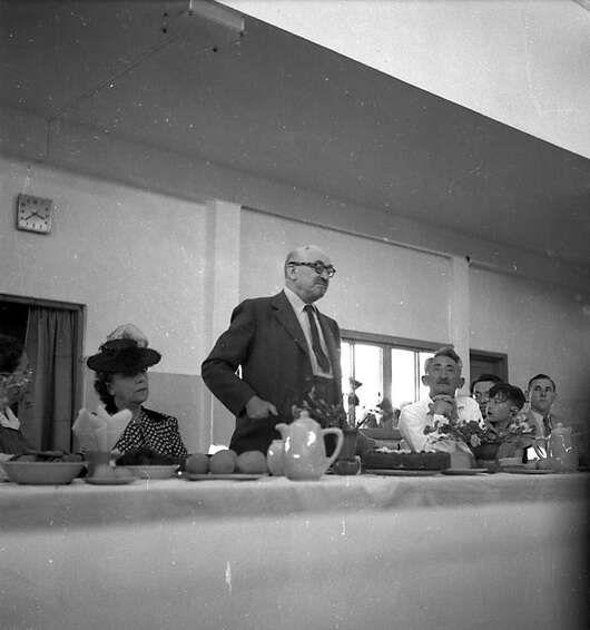 שלמה לביא מברך את האורח ליד שולחן ערוך:
