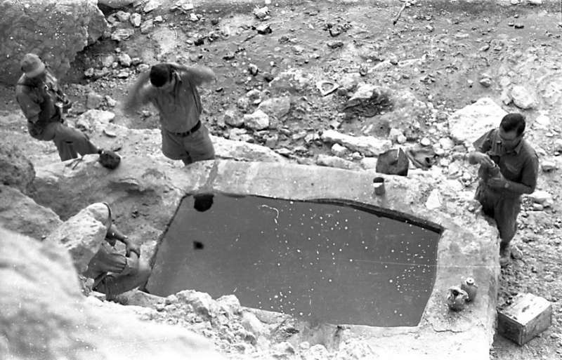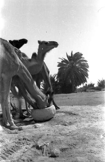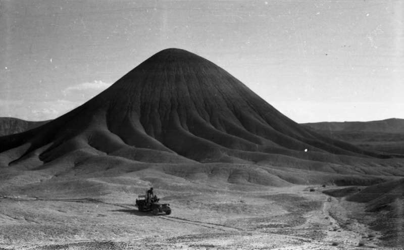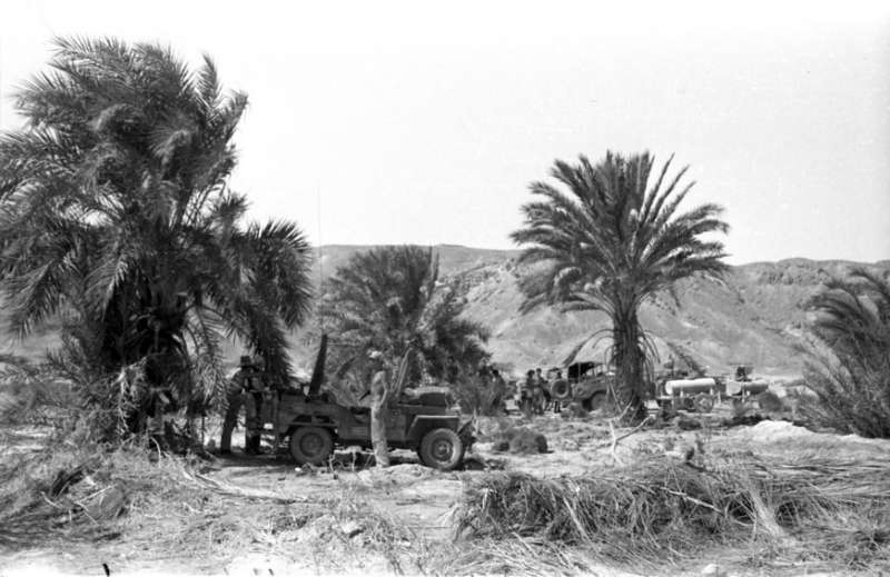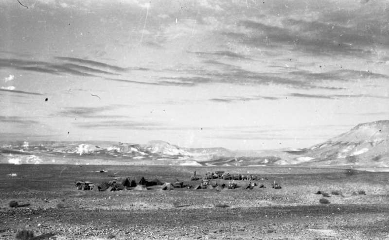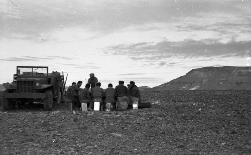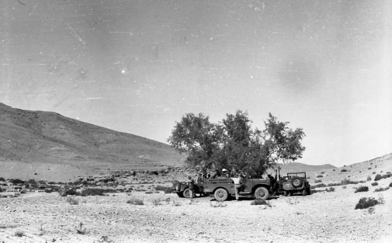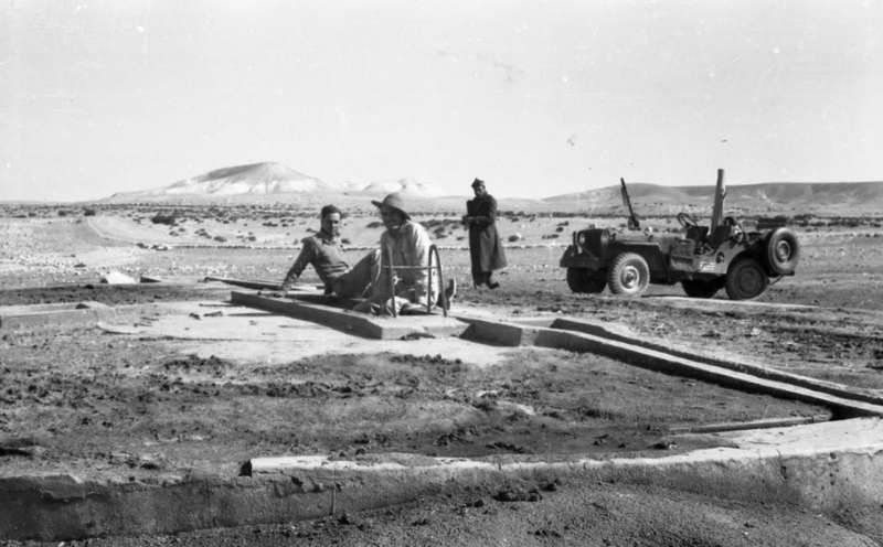 ביר רחמה. מכאן תחל בעתיד להיבנות העיירה ירוחם. עומד ליד הג'יפ, עטוף בשינל, הרי אפטקר הסייר הראשי של הכוח, ליד הבאר עם כובע רב שוליים, קרלו מהנדס דרכים איטלקי שבערבים היה משרטט מפות תוצאות הסיור היומי ומשמאל פנחס שטיינברג נהג הג'יפ.