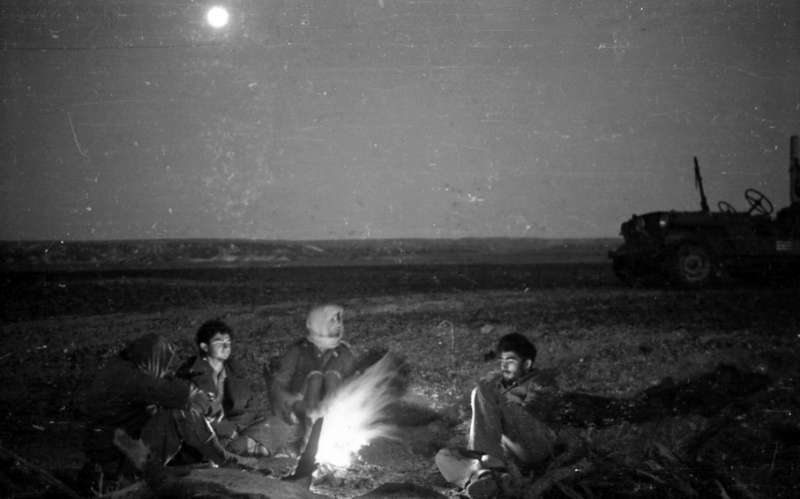 המחנה לאחר ההצנחה במיישר הוקם בנחל חיון. בתצלום: ליד מדורה בנחל חיון.