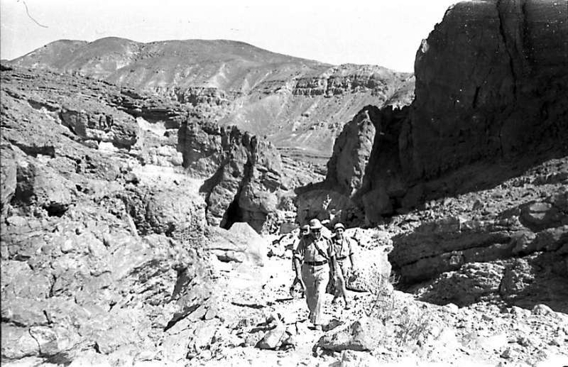 במבצע עובדה בקשו סיירי חטיבת הנגב להגיע לאילת לאורך הגבול עם מצרים. הייתה הנחייה לא לחצות את הגבול מחשש לתקרית בינלאומית. באזור ראס א-נקב לא היה ניתן מבחינת העבירות לקיים הנחייה זו לפיכך החליט מפקד החטיבה נחום שריג לעבור את הגבול בבקעת הירח ולחזור לכיוון אום רשרש (מפרץ אילת) דרך מעבר הגבול המצרי בראס אל נקב. בתצלום: מהנדס הדרכים קרלו מחפש מעבר חליפי לראס אל נקב בג'בל רדדי.