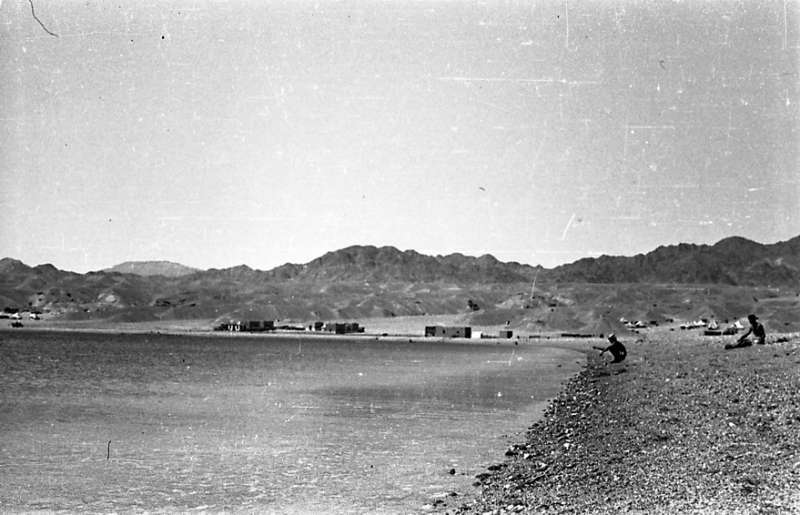 על חוף ים אילת. ברקע מבני משטרת אום רשרש