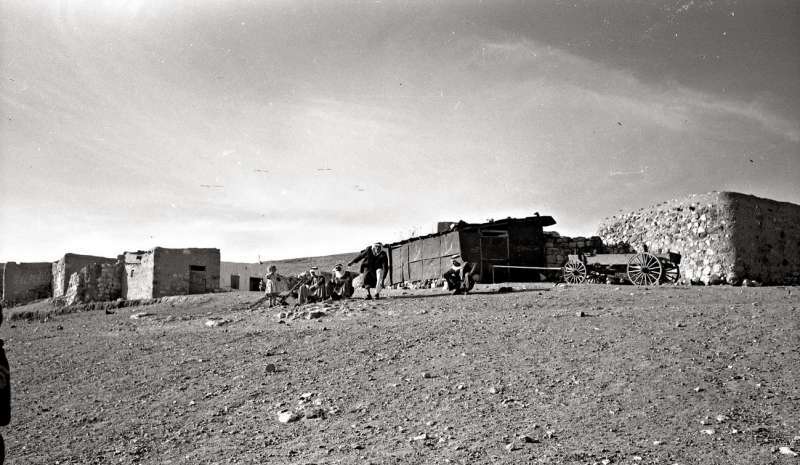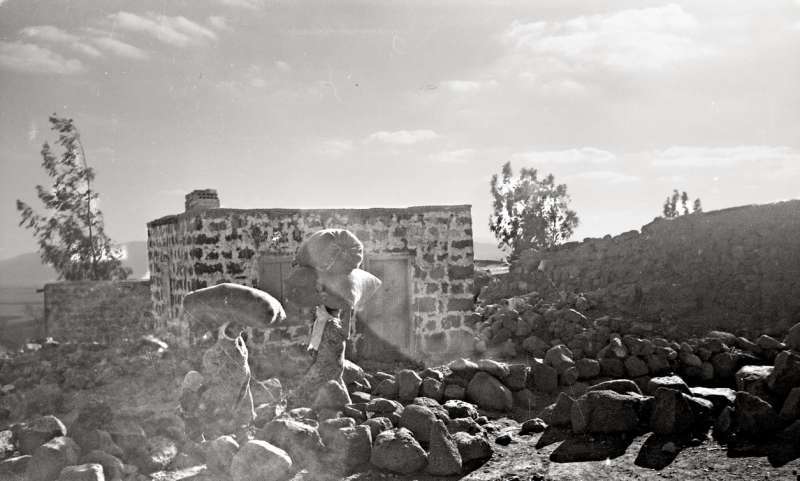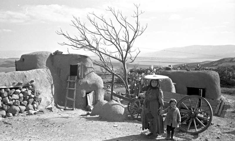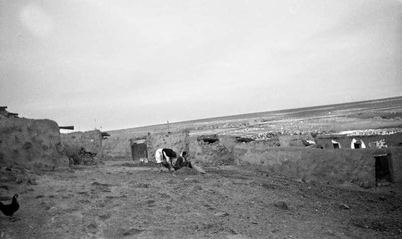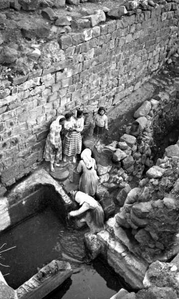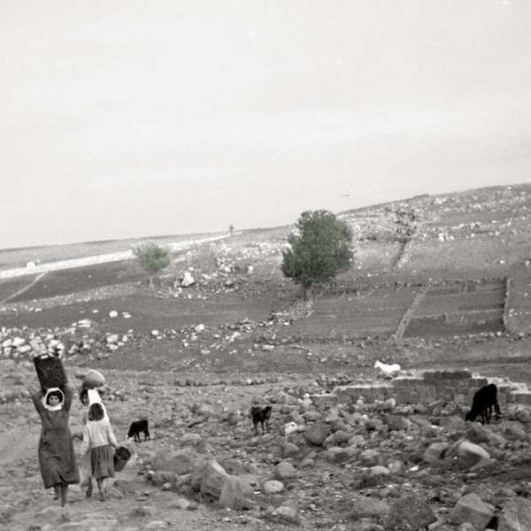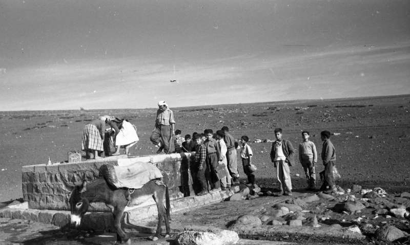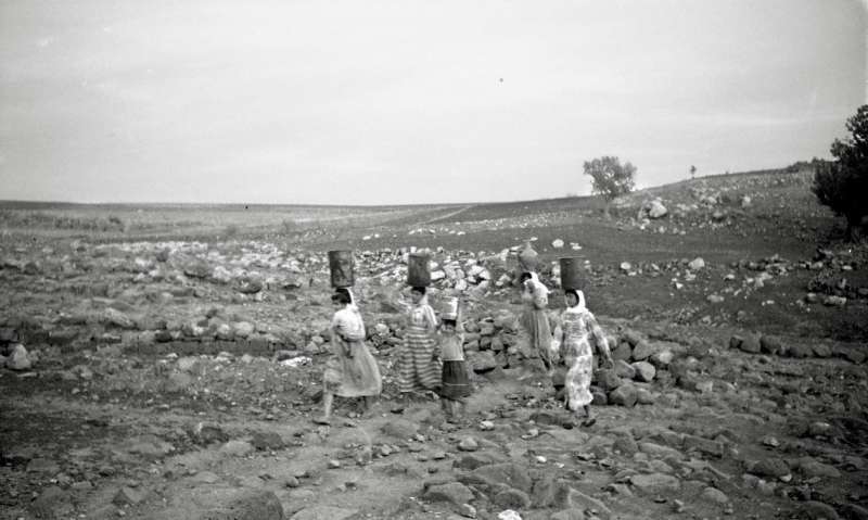 בשני התצלומים ניתן לראות כיצד הביאו מים מהבאר לבתי הכפר - בכדים ופחים נשאום על הראש נשות ובנות הכפר