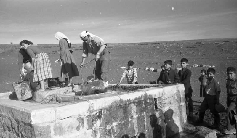 חוסני עקב זועבי עוזר לנשים להוציא מים מהבאר בנאעורה