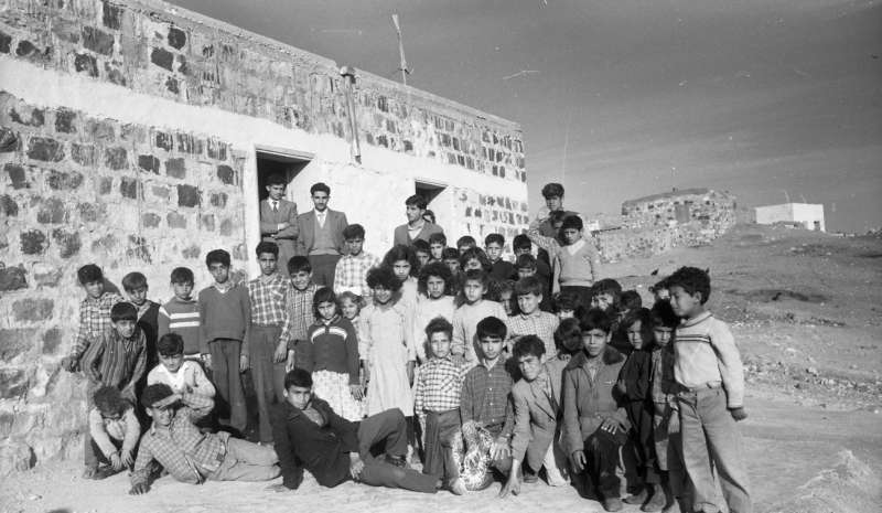מבנה בית הספר של נאעורה לידו התלמידים והמנהל מר מחמוד אל ארשיד זועבי