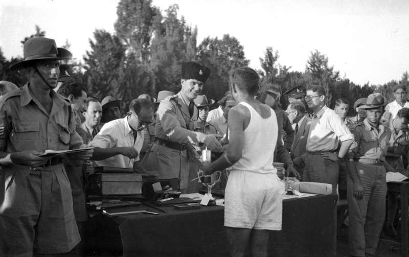 אנשי משטרה ומכובדים. שני משמאל עומד בכור שיטרית, שהיה אז משפטן. עם קום המדינה מונה להיות שר המשטרה של משטרת ישראל
