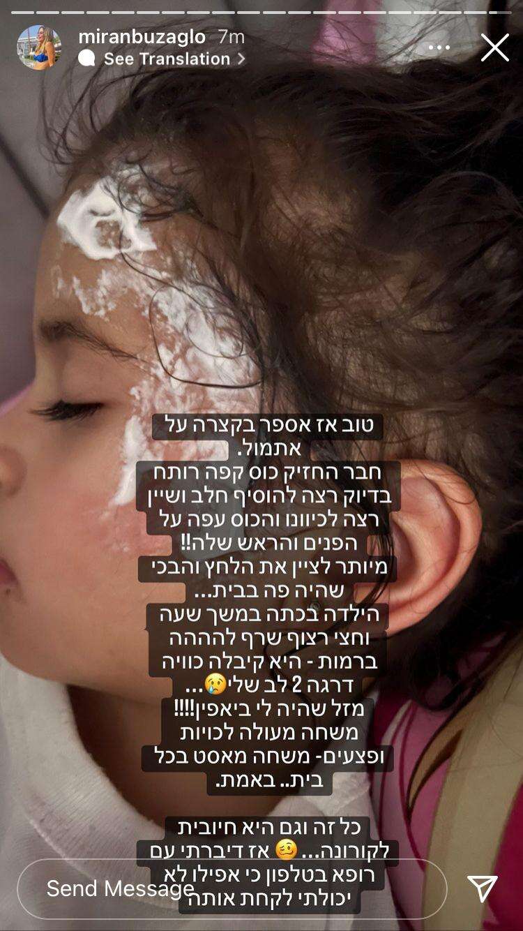 "טוב, אז אספר בקצרה על אתמול", כתבה מירן לעוקביה בסטוריז שהעלתה באינסטגרם. "חבר החזיק כוס קפה רותחת. בדיוק כשרצה להוסיף חלב, שיין (בתה של מירין, י"ד) רצה לכיוונו והכוס עפה על הפנים והראש שלה!!", תיארה את השתלשלות האירועים.