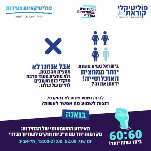 הערב יתקיים בתל-אביב אירוע "60:60 – ביחד שוות יותר" המבקש להעלות את המודעות לייצוג נשים במרחב הציבורי ולקדם חקיקה עבור ועל-ידי נשים. האירוע ביוזמת התאחדות הסטודנטיות והסטודנטים הארצית, גוף התקשורת הפמיניסטי "פוליטיקלי קוראת" והתכנית לקידום נשים לפוליטיקה, "פוליטיקאיות צעירות – מעזות, משפיעות, מנהיגות". להרשמה