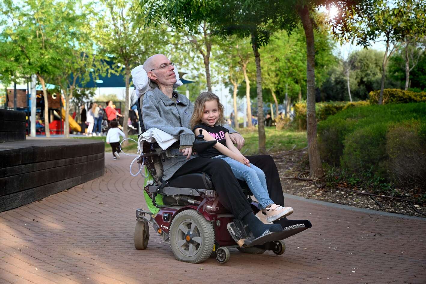 אלה הקטנה נכנסת לסלון. "אני יודעת שיש לאבא מחלה, היא בתוך הגוף שלו והיא לא נותנת לו לדבר", היא אומרת. "הילדים בגן מדברים איתי על אבא שלי, שואלים אם יש לו מחלה קשה, רואים שהוא בא לקחת אותי עם העגלה שלו. אני מאוד אוהבת את זה. הכי אני אוהבת ללכת עם אבא לפארק. אנחנו נוסעים לשם כשאני על הברכיים שלו בעגלה, ישר מהגן.